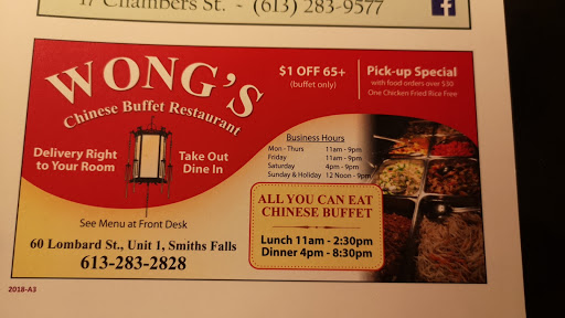Latest reviews photos and ratings for Wongs Chinese Buffet Restaurant at 60 Lombard St in Smiths Falls - view the menu hours phone number address and map. Wongs Chinese Buffet Restaurant Smiths Falls address Wongs Chinese Buffet Restaurant Smiths Falls phone 1 613-283-2828 Wongs Chinese Buffet Restaurant Smiths. Wongs Chinese Buffet Restaurant is a business providing services in the field of Restaurant.